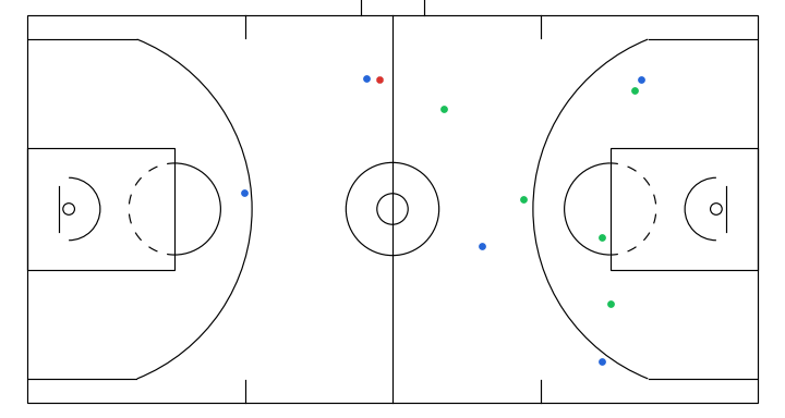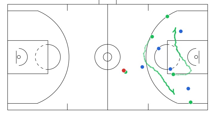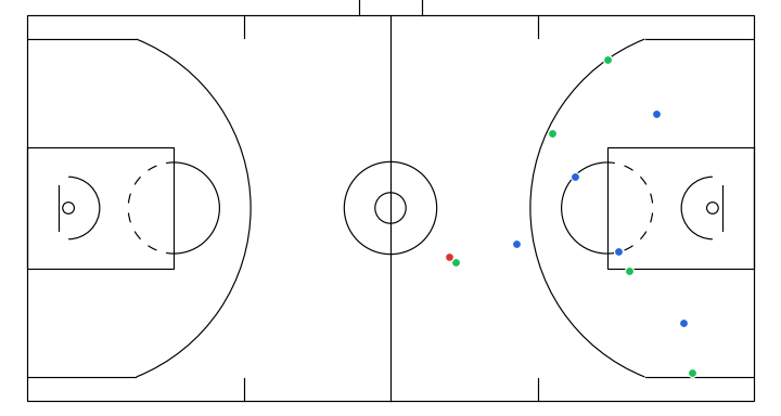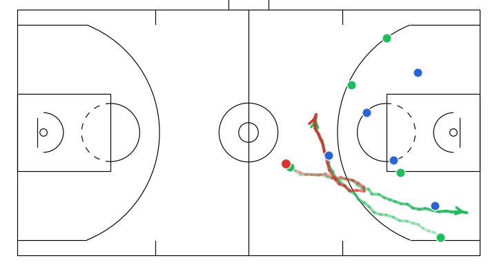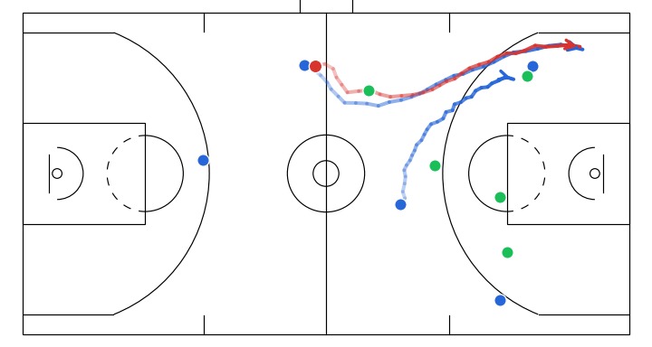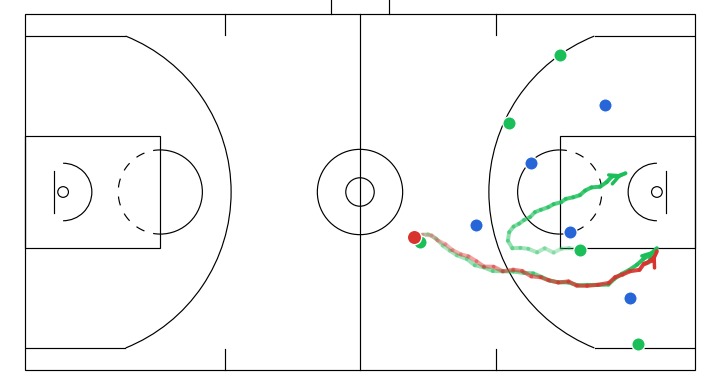 During NBA games, coaches often have to plan attacking plays to break through a defensive setup within a short period of time. They may sketch out instructions for a few players on a whiteboard, and rely on their mental model to project how both teammates and opponents might move in response. Prior work has explored data-driven approaches for this problem, using imitation learning1 and GANs2 to generate sketch-conditioned gameplay simulations. In this post, I explore whether diffusion models3 4 can be used for this task as well. If you are unfamiliar with diffusion, please check out this post.